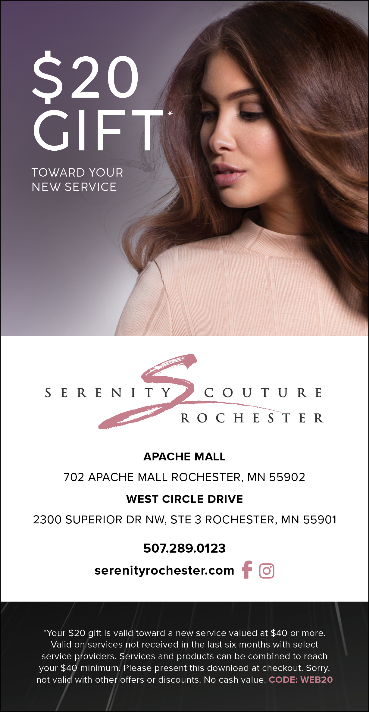 We love our guests and want more just like you! When you refer a friend to Serenity Couture Rochester, we’ll give you $20 off your next service as a way of saying thanks. To receive your gift, your friend must come in to experience a service with us and mention who referred them. Your friend will get $20 off their first service with us as well.